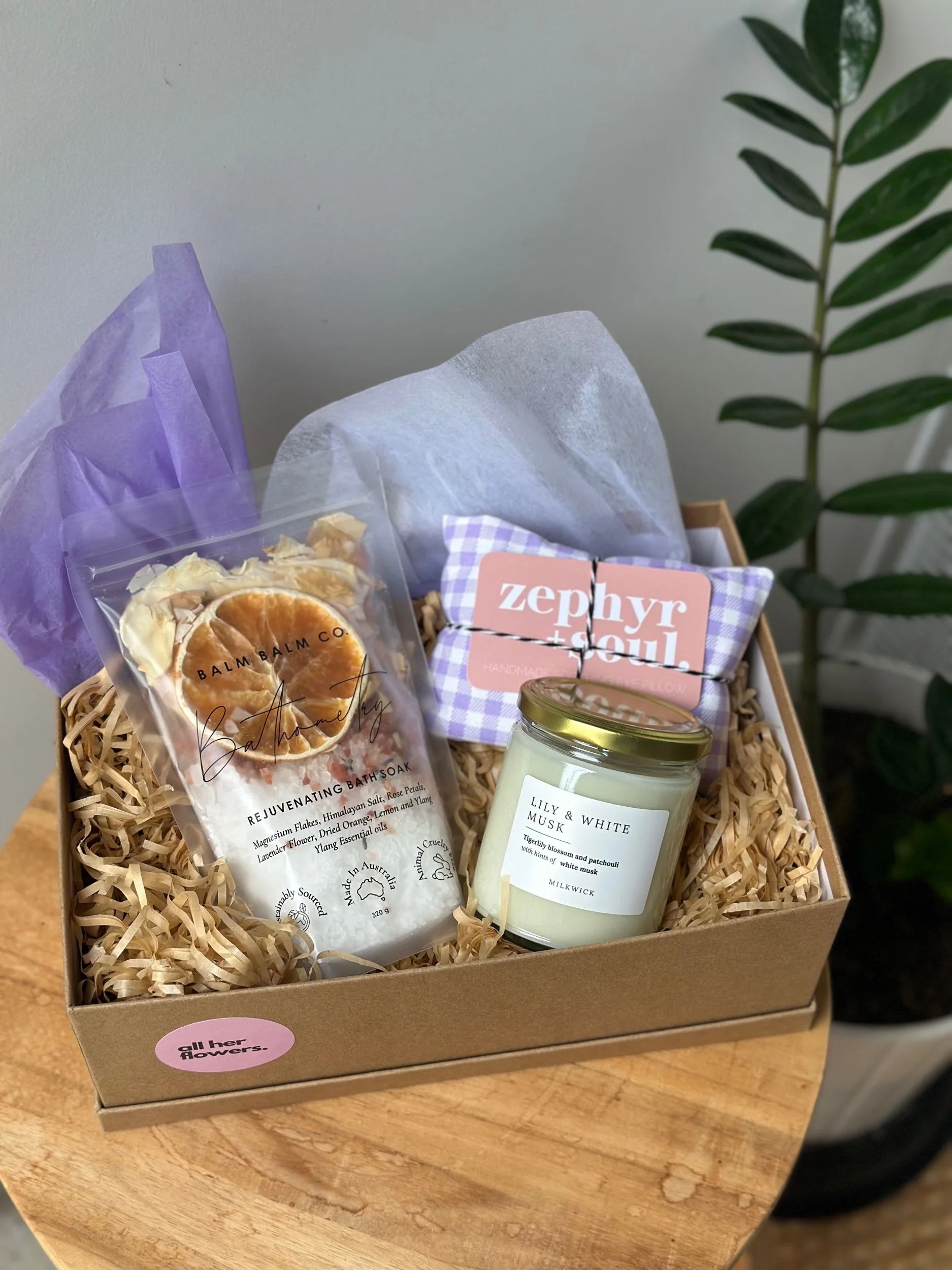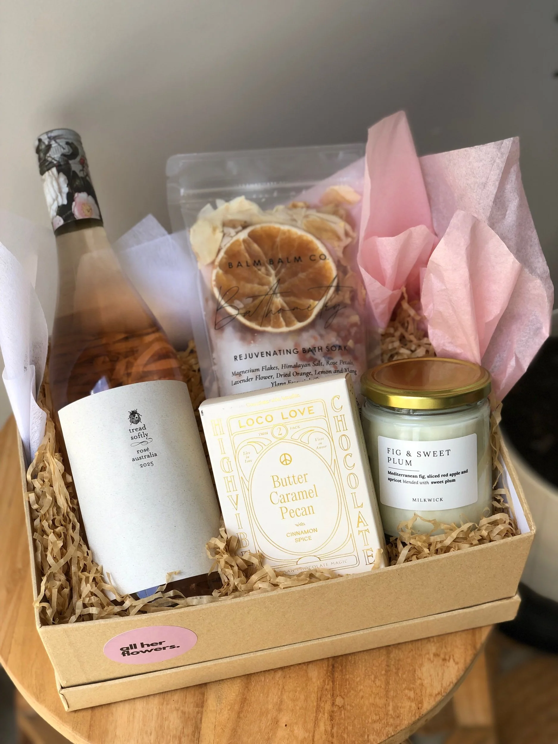 There’s never a bad time to make someone’s day. All Categories: All All Florals Hampers Add Ons All / All The Sip & Savour Hamper $109.00 Standard Bunch - Wrapped $75.00 The Posie Hamper $95.00 The Rejuvenate Hamper $140.00 The Unwind Hamper $90.00 The Healing Hamper $90.00 Double Bunch - Wrapped $130.00 Vase Flower Arrangement $89.00 Seasonal Bunch $59.00 Oriental Lillies $49.00 Sold Out Loco Love Chocolate from $8.00 Milkwick Soy Candle $30.00 Balm Balm Co, Bath Salts $35.00 Visit @_allherflowers on Instagram to see current flower availability & stock.